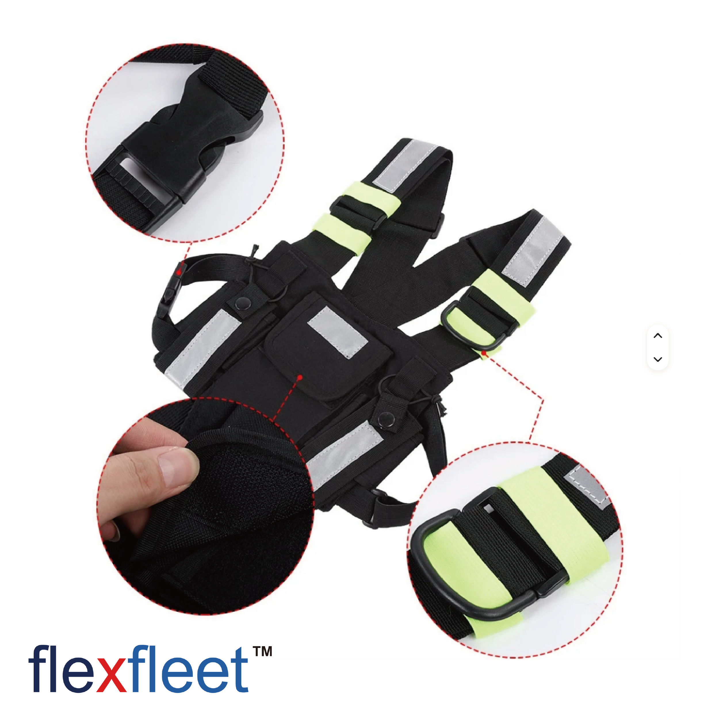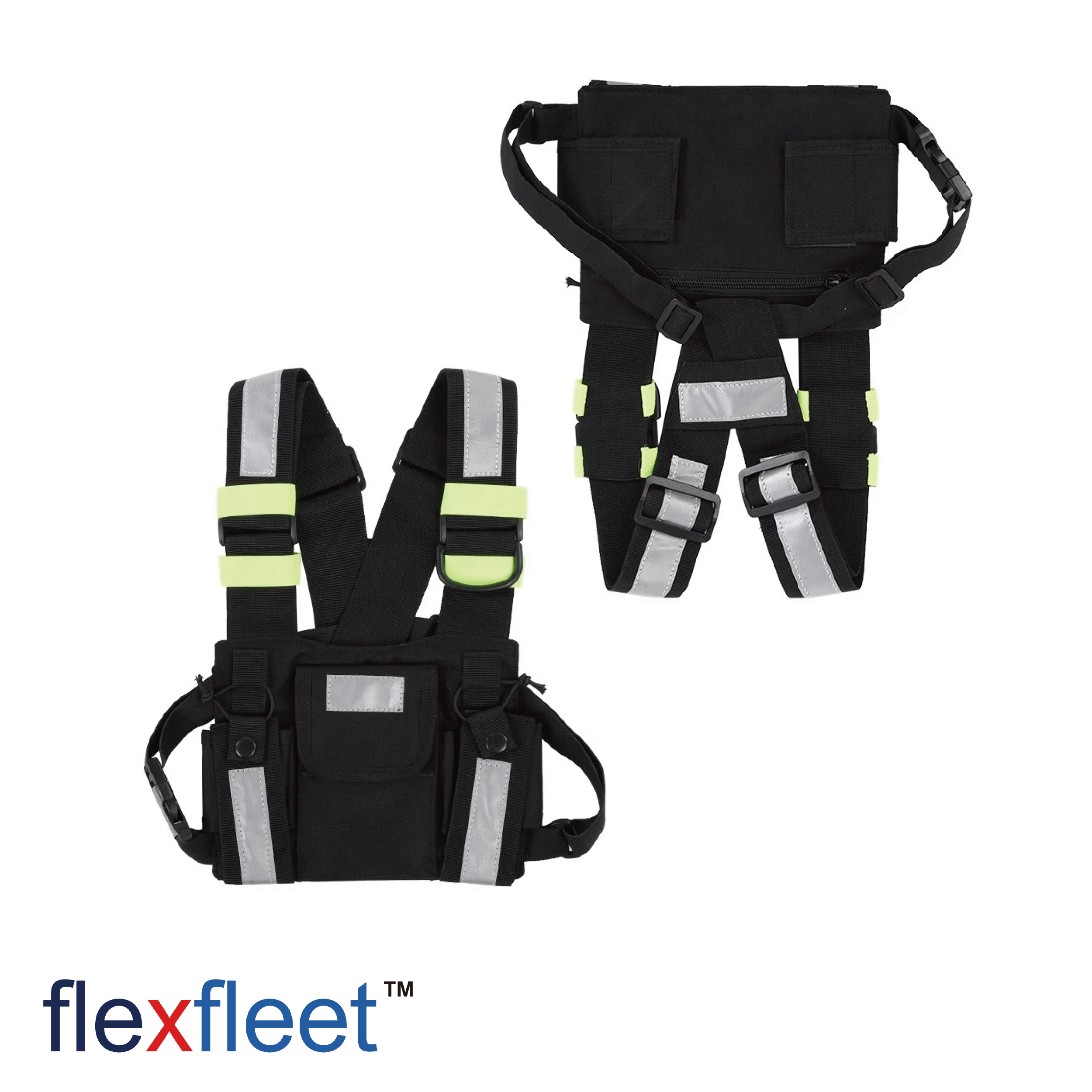 ポータブル無線機を2台を前面に格納することができるチェストハーネスタイプのホルスターの再帰反射パネル付きタイプです。